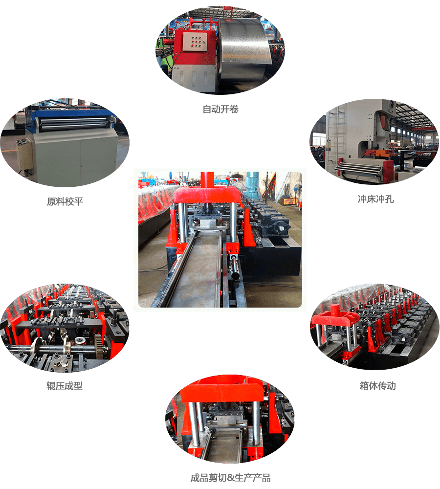 開卷→引料校平→儲料→伺服送料→沖翻邊孔→儲料→導(dǎo)向引料→輥壓成型→仿形切斷→托板出料