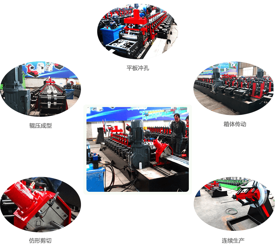 開卷—導(dǎo)向進(jìn)料—液壓沖孔—輥壓成型—跟蹤切斷—托板出料