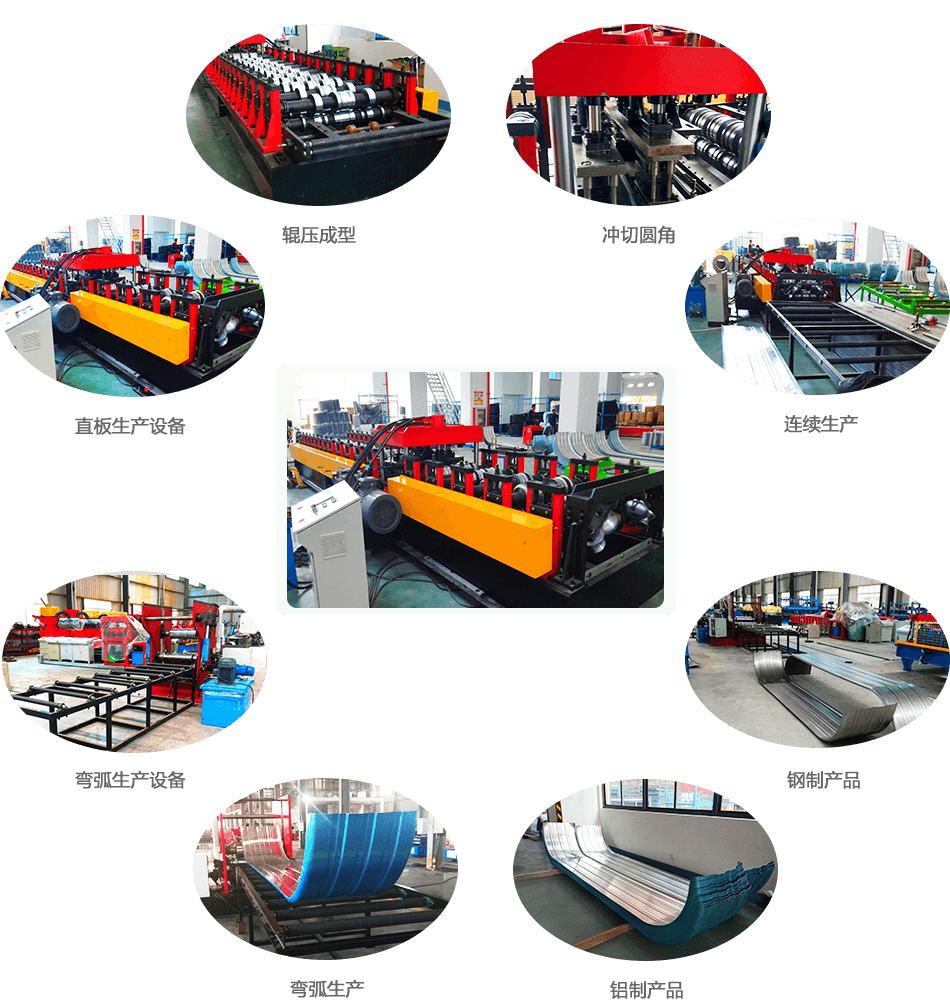 上料 → 導向整平 → 輥壓成型 → 沖孔+沖圓角+切斷→ 輥壓成型 → 出料→彎弧→成品