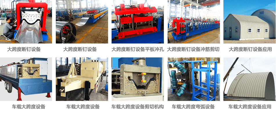 車載大跨度設(shè)備工藝流程: 開(kāi)卷—導(dǎo)向進(jìn)料—輥壓成型—仿形切斷—托板出料—滾彎—安裝鎖合